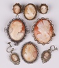 | 80 | Three shell carved cameo brooches (1 with pin a/f), an oval cameo pendant and 2 pairs of cameo earrings | 40-60 |