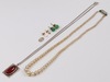 | 60 | A pair of green hardstone ear studs, a silver ingot pendant set an oval hardstone on a silver chain and a string of simulated pearls | 40-50 |