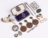| 63 | A silver and enamelled Royal Army Medical Corps sweetheart brooch, an Intelligence Corps sweetheart brooch, a rectangular pierced silver floral brooch and a carved horn brooch in the form of a bird etc | 40-60 |