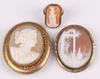 | 64 | A 14ct yellow gold ring set a rectangular shell carved cameo of a standing classical lady, size I 1/2, 4.9 grams gross and 2 shell carved cameo portrait brooches in gilt mounts | 40-60 |