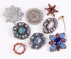 | 65 | A silver gilt star shaped bar brooch set red stones, a silver filigree brooch, a diamonte brooch, a gilt stick pin in the form of a Kiwi and 5 polished hardstone brooches | 60-80 |