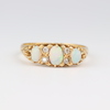 62 | An 18ct yellow gold dress ring set 3 oval opals supported by 4 small diamonds, size P 1/2, 2.6 grams | 70-90 |