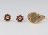 70 | A gentleman's 9ct yellow gold signet ring (cut) and a pair of 9ct yellow gold garnet ear studs, 5.2 grams gross | 120-150 |