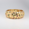 74 | A lady's impressive yellow gold marked 18K hinged bangle, set 66 multi coloured sapphires approx 100ct in total, 8cm diameter, 112.8 grams gross | 7000-9000 |