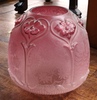 • A gilt metal reeded oil lamp with Corinthian column capital and yellow glass reservoir with pink etched glass shade 77cm h