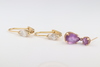 85 | A pair of 18ct yellow gold paste set earrings 2.5 grams together with a single yellow gold, testing as 14ct tea drop shaped earring set amethyst 1 grams | 100-140 |