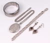 98 | A silver curb link bracelet 20cm, an engraved hollow silver bangle, an oval engraved silver locket on a fine chain and a pair of unmarked silver Art Nouveau style drop earrings set cabochon stones 95 grams | 60-80 |
