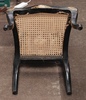 • A Victorian slipper shaped ebonised nursing chair upholstered in white material on turned supports with stretcher