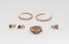 | 114 | A 9ct gold gem set pendant, a pair of 9ct yellow gold hoop earrings and 1 other pair of earrings 4.5 grams, together with a gilt metal locket | 70-90 |