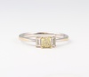 | 119 | A lady's 18ct white gold 3 stone engagement ring set a princess cut yellow diamond (approx 0.45ct, clarity VS) set in yellow gold mount surmounted by 2 baguette cut diamonds (0.17ct total, colour g, clarity VS), size N | 700-900 |