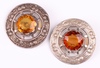 | 113 | Two Scottish pierced metal plaid brooches set amber coloured stones 6cm | 50-75 |