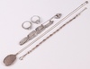 | 121 | A 925 silver mesh bracelet 21cm, a pierced silver bracelet with Grecian key decoration and padlock clasp and an engraved oval silver locket hung on a fine silver, together with 2 dress rings | 40-50 |