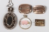 A yellow metal and demi-pearl set oval mourning brooch with hair panel to the centre 2.5cm, 1 other 2cm, rectangular ditto 1.5cm, a white metal oval pendant with hair panel to the reverse 4cm hung on a metal chain and a gilt metal circular pendant2.5cm £100-150