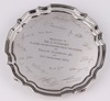 | 163 | A silver salver with bracket border on scroll feet, with engraved signatures, Birmingham 1988 by J B Chatterley & Sons Ltd, 20cm, 344 grams | 240-280 |