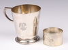 | 167 | A silver christening tankard (dented and misshapen) London 1944, together with an engraved silver oval napkin ring London 1945, both by Wakeley & Wheeler, both are inscribed, 138 grams | 100-140 |