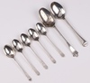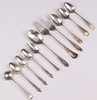 | 183 | Three silver apostle spoons Sheffield 1912, a silver spoon and fork Birmingham 1944 (spoon bent), 3 Old English pattern teaspoons, a coffee spoon, mustard spoon and a pudding fork, 178 grams | 130-160 |