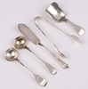 | 185 | A pair of Victorian silver sugar tongs London 1880, a George IV silver fiddle pattern teaspoon Newcastle 1826, a pierced Sterling silver teaspoon, silver butter knife and 2 salt spoons, 102 grams | 80-100 |