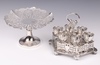 185 | A pierced silver plated 6 piece egg cruet 19cm together with a circular pierced plated pedestal tazza 22cm | 40-50 |