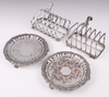 186 | A 19th Century 7 bar silver plated toast rack (1 bar a/f), 1 other on bun feet (slightly misshapen) and a pair of 19th Century engraved silver plated salvers on panelled supports 18cm (plate worn in places) | 40-50 |