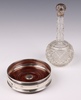 195 | A club shaped cut glass scent bottle with embossed silver lid 18cm, marks rubbed, together with a 925 standard silver bottle coaster with millennium hallmark 12cm | 50-70 |