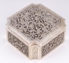 | 188 | An Eastern pierced and engraved silver plated box with hinged lid decorated birds amongst flowering branches 7cm x 14cm x 14cm | 50-75 |