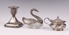 | 189 | An oval embossed silver mustard pot with hinged lid and blue glass liner (marks rubbed) 37 grams, an Art Deco silver candlestick 7cm (dented, marks rubbed) and a German cut glass and silver salt in the form of a swan 7cm | 40-50 |