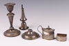 | 192 | A silver napkin ring Birmingham 1944, an oval embossed silver mustard (marks rubbed) 73 grams and 2 silver candlesticks 15cm (1 a/f) | 60-80 |