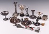 | 196 | A pair of silver plated chamber sticks with snuffers, silver plated taper stick and sniffer, letter clip in the form of a greyhounds head set hardstone eyes and other items of silver plate | 40-50 |