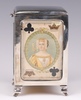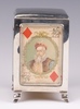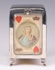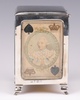 Levi & Salaman, an Edwardian silver playing card holder decorated playing cards, the interior with sprung movement containing 2 packs of cards, Birmingham 1903 (marks rubbed) 12cm h x 8cm w x 8cm d