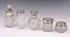 | 212 | An Edwardian globular cut glass scent bottle complete with stopper and embossed silver lid, Birmingham 1901, 9cm (lid dented), a panel cut pin jar with silver lid 8cm (lid dented), a square cut glass perfume bottle with silver collar 10cm (chips to rim) and 2 small circular cut glass dressing table jars with silver lids | 40-60 |