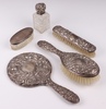 | 215 | A filled silver and embossed 3 piece silver backed dressing table set with hand mirror (a/f), hair brush and clothes brush Birmingham 1959 by W I Broadway & Co., together with an oval cut glass dressing table jar with silver lid (dents to lid) and a pair of cut glass scent bottles with silver lids (dents to kids) | 50-75 |