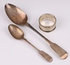 | 218 | A William IV silver fiddle pattern table spoon, London 1823, a silver fiddle pattern teaspoon London 1888 and a silver napkin ring, 106 grams | 70-90 |