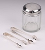 | 224 | Two pairs of silver sugar tongs Birmingham 1921 and Sheffield 1931, together with a faceted glass pin jar with silver lid (dented) 48 grams | 40-50 |