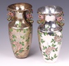 | 227 | Heng Li of Tianjin, a pair of early 20th Century Chinese export silver and enamelled vases decorated prunus flowers, circa 1900, each of yen yen form, with flared rim and waisted neck, set at the shoulder with twin enamelled prunus-form handles. The globular bodies are decorated in bright enamels with peony blossoms and leafy sprays, reserved on one side with a shield-shaped cartouche left blank. The bases stamped with the mark Tianjin Hengli Zuwen Wen. Height 25cm; diameter of mouth rim 11cm, approx 950 grams gross | 1000-1500 |