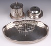 | 228 | A engraved silver plated biscuit barrel and cover (lid not quite closing), ditto muffin dish (interior plate missing), oval twin handled tea tray and a 7 bar toast rack | 30-50 |