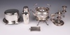 | 216 | A silver salt with blue glass liner, a silver jam spoon, an engraved silver plated cigar case, crocodile and silver mounted purse, a cut glass perfume atomiser with silver collar and a oval cut dress dressing table jar with embossed silver lid (some holes to lid) | 50-70 |