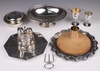 | 229 | An oval silver plated biscuit barrel with hinged lid by Walker & Hall, silver plated cocktail shaker, ditto hip flask, 3 light candelabrum and a Britannia metal tea kettle (handle a/f) | 40-50 |