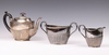 A 19th Century silver plated hot water jug (handle f), 2 silver plated hot water jugs, ditto coffee pot and a mahogany and plated twin handled tea tray 52cm x 33cm