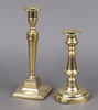 675 An 18th Century circular polished brass candlestick 18cm h (base misshapen) together with an 18th/19th Century Adam style candlestick on a square base 24cm (slightly misshapen and with solder repair) 30-40