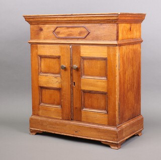 A 19th Century cedar table top cigar cabinet with moulded cornice, fitted shelves enclosed by panelled doors, raised on bracket feet 52cm h x 46cm w x 25cm d
