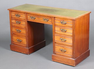 An Edwardian walnut desk with green leather inset writing surface, fitted 1 long and 8 short drawers, raised on a platform base 75cm h x 130cm w x 49cm d (desk in 1 section)