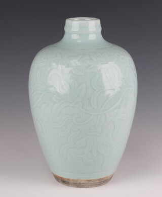 A 20th Century Chinese baluster celadon vase decorated with formal flowers 30cm
