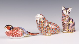 Three Royal Crown Derby Imari pattern paperweights - walrus I.II 10cm, cat I.II and pheasant XLIX, all with gold sappers