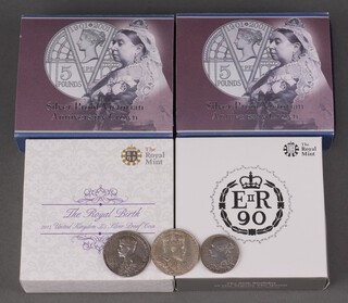 Two 2001 silver proof commemorative Victorian five pound crowns, a 2016 proof five pound silver commemorative coin and a 2015 proof five pound silver coin all cased and 3 other silver commemorative coins, 147 grams