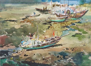 William Lionel Wylie (1851-1931), etching signed in pencil, beach scene with fishermen landing a catch and St Michael's Mount in the background 17cm x 24cm