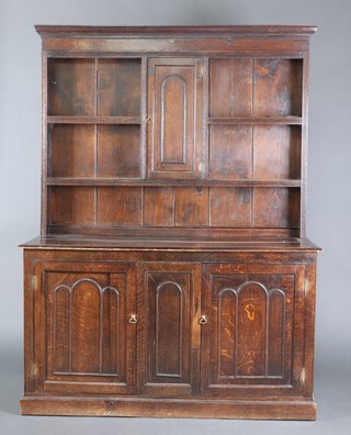 An 18th Century oak dresser, the raised back with moulded cornice, cupboard and 3 shelves, the base enclosed by arched panelled doors 194cm h x 145cm w x 53cm d