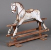 | 1092 | In the manner of Ayres, a dappled grey painted rocking horse, raised on a pine cruciform base 90cm h x 107cm w x 38cm d | 400-600 |