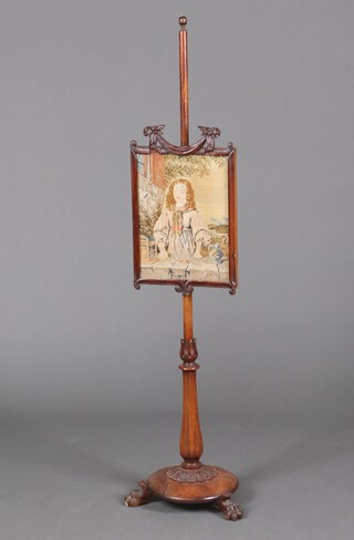A Victorian rosewood pole screen with rectangular Berlin wool work panel decorated a girl, raised on a turned column with circular base and paw feet 142cm h