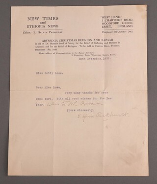 Estelle Sylvia Pankhurst, a typed letter from Pankhurst to a Miss Betty Ross on headed paper of the New Times and Ethiopia News, dated 30th September 1936 reading "Dear Miss Jones. Very many thanks for your kind card with all good wishes for The New Year (letter continues in pencil) also to our Arram? Yours sincerely E Sylvia Pankhurst (signature also in pencil)