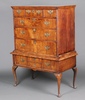 901 | A Queen Anne oak lined crossbanded walnut chest on stand with moulded cornice, fitted 3 short drawers above 3 long drawers, the base with 1 long drawer, raised on later cabriole supports 152cm h x 103cm w x 56cm d | 200-300 |